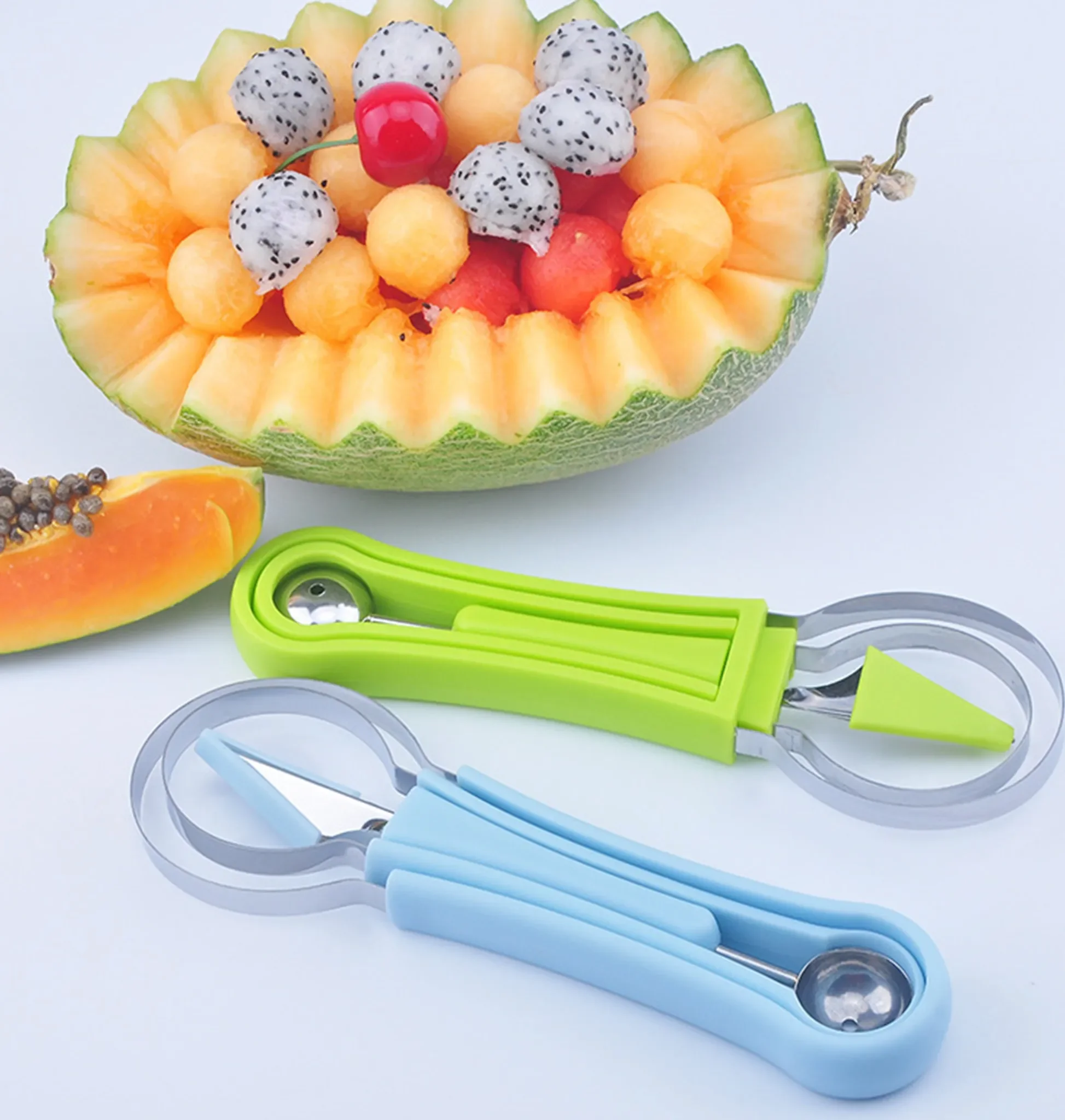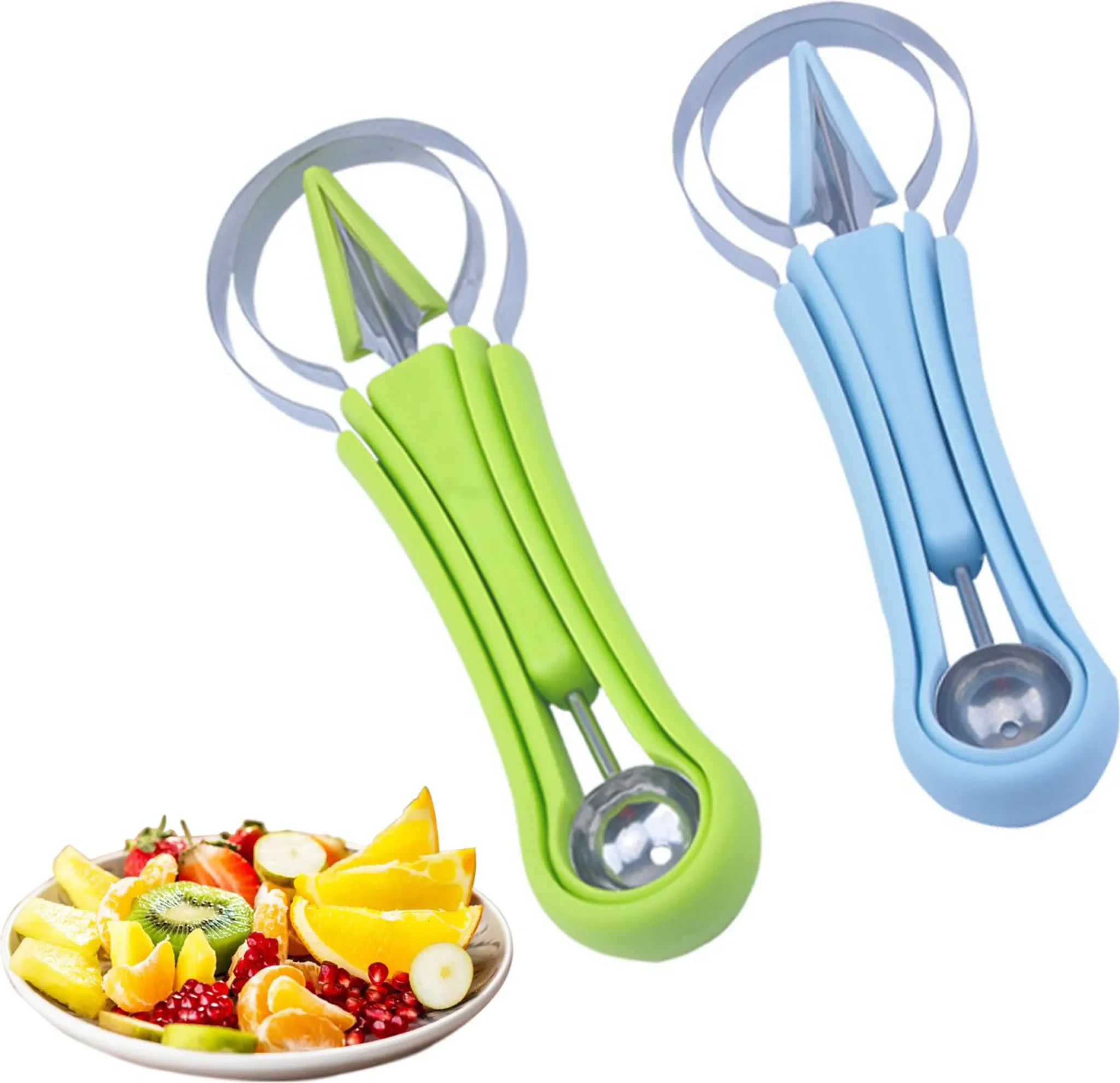 Dank der vielseitigen Werkzeuge lassen sich mühelos gleichmäßige Fruchtkugeln, dekorative Schnitte und kreative Muster gestalten. Ideal für Melonen, Kiwis, Cantaloupe oder Gemüse – perfekt für Küche, Buffet, Desserts und besondere Anlässe.