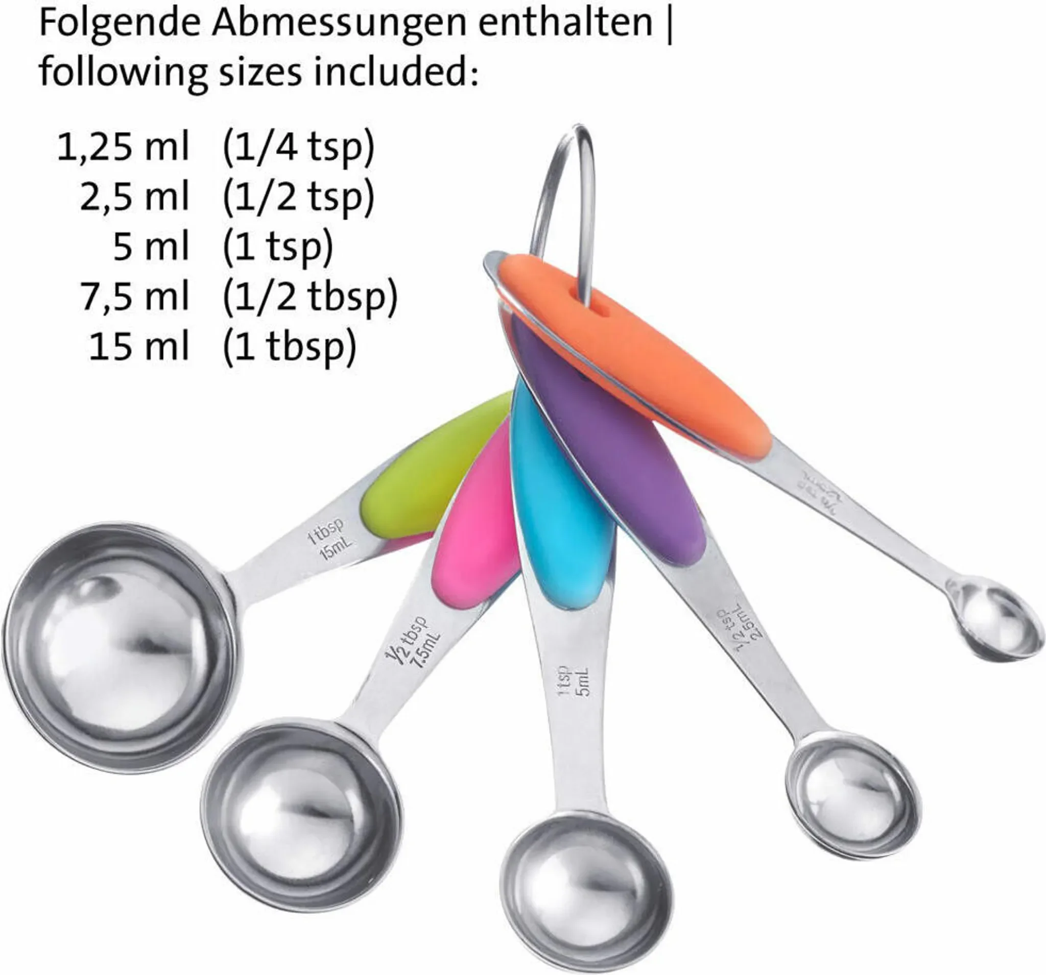 Dieses kompakte Messlöffel-Set erleichtert das genaue Abmessen von Zutaten beim Kochen und Backen. Die fünf Messlöffel sind farblich gekennzeichnet und ermöglichen eine schnelle Orientierung – ideal für den täglichen Einsatz in der Küche.