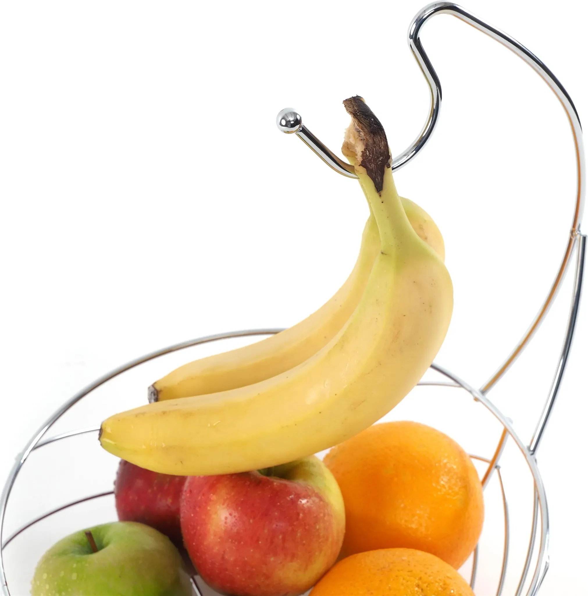 Der integrierte Bananenhaken ermöglicht das separate Aufhängen von Bananen oder Trauben, fördert eine gleichmäßige Reifung und hilft, Druckstellen zu vermeiden. Die zweistufige Präsentation sorgt für Ordnung und verleiht dem Raum einen modernen Akzent.