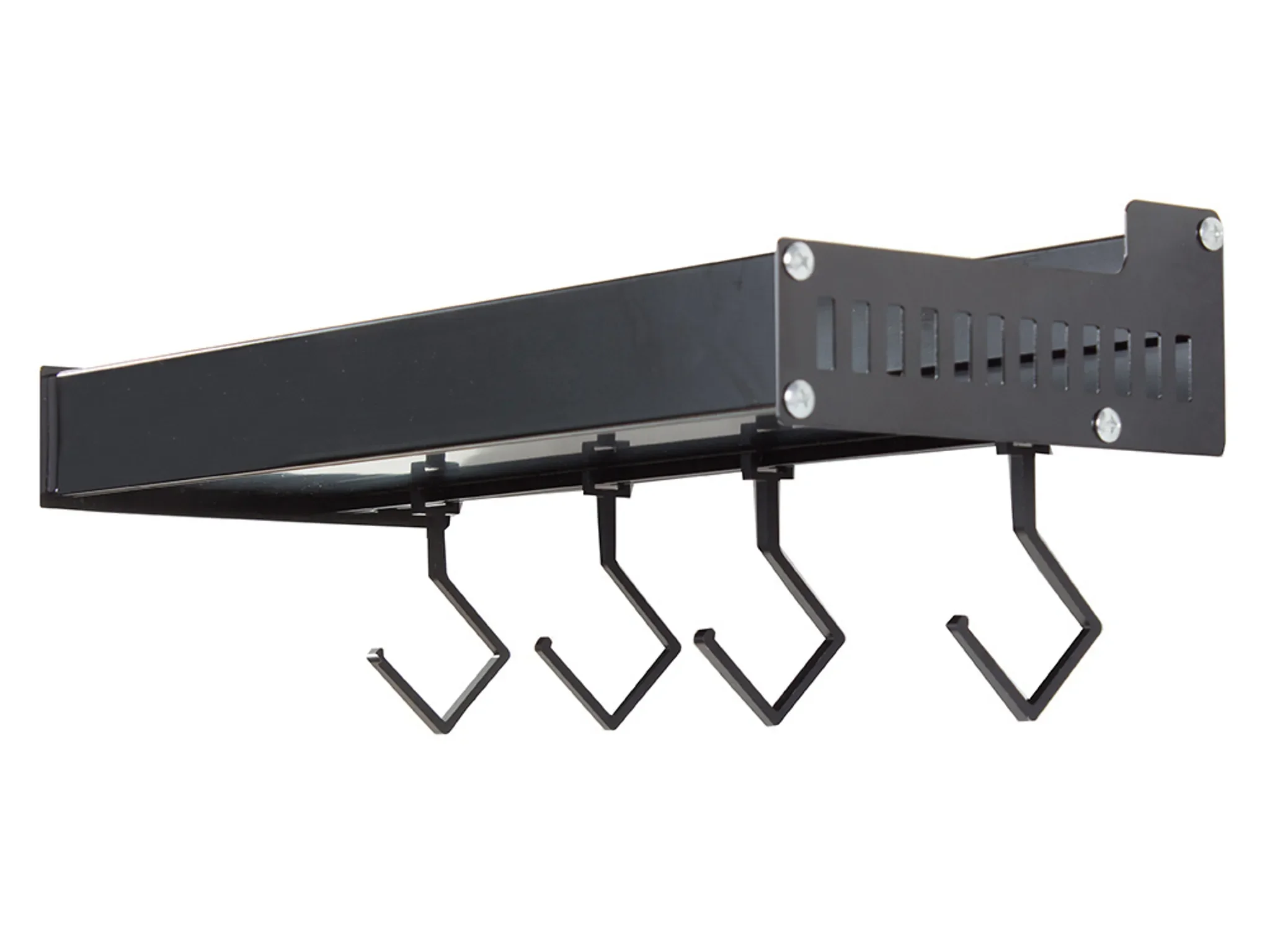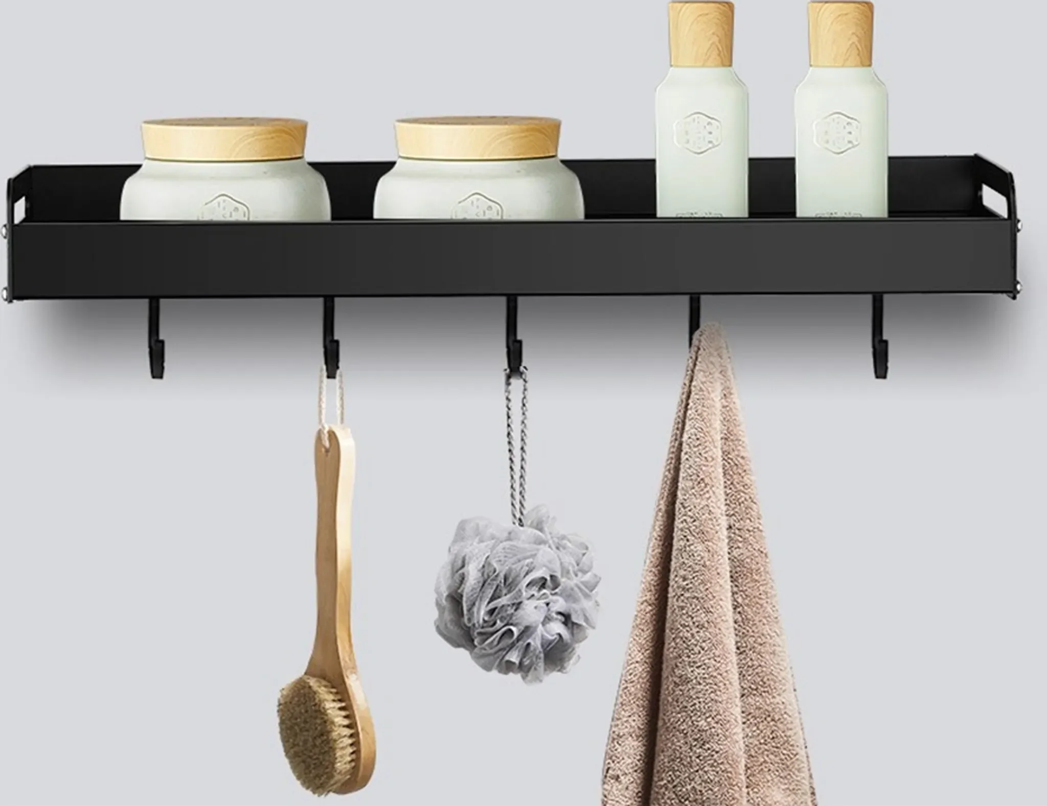 Vier abnehmbare Haken ermöglichen das praktische Aufhängen von Handtüchern, Küchenutensilien oder Accessoires. Dank des schlichten, modernen Designs fügt sich das Regal harmonisch in industrielle wie auch klassische Einrichtungsstile ein.