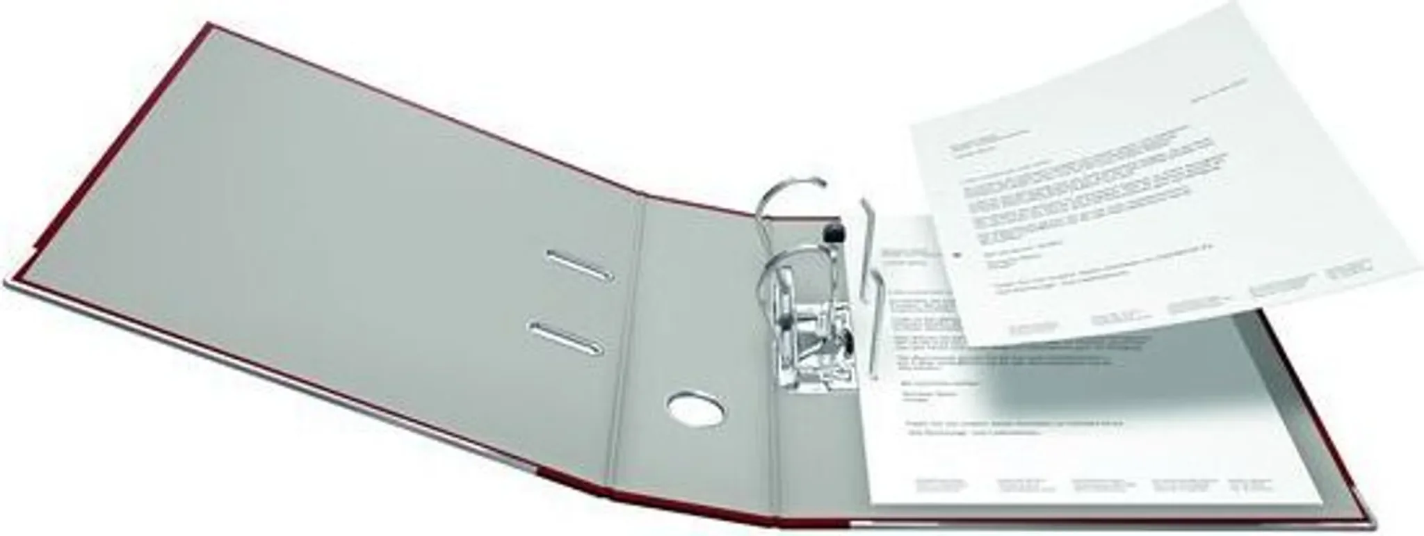 Eine verstärkte Qualitäts-Hebelmechanik sorgt für sicheren Halt der Unterlagen, während Kantenschutz und Griffloch den täglichen Gebrauch erleichtern. Das geklebte Rückenschild ermöglicht eine klare Beschriftung und schnellen Zugriff.