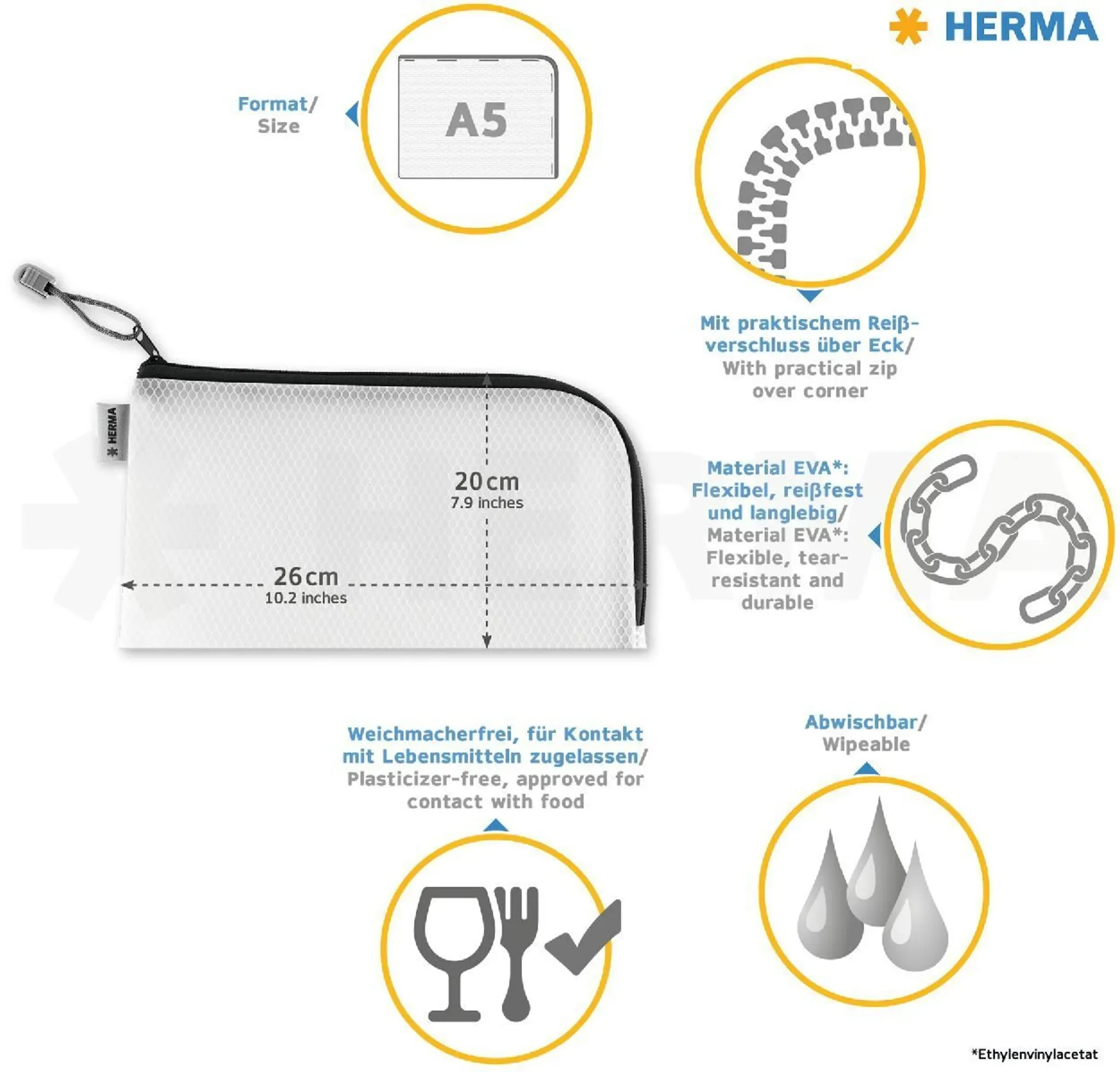 | Im Paket | 1 × Reißverschlusstasche DIN A5 |
